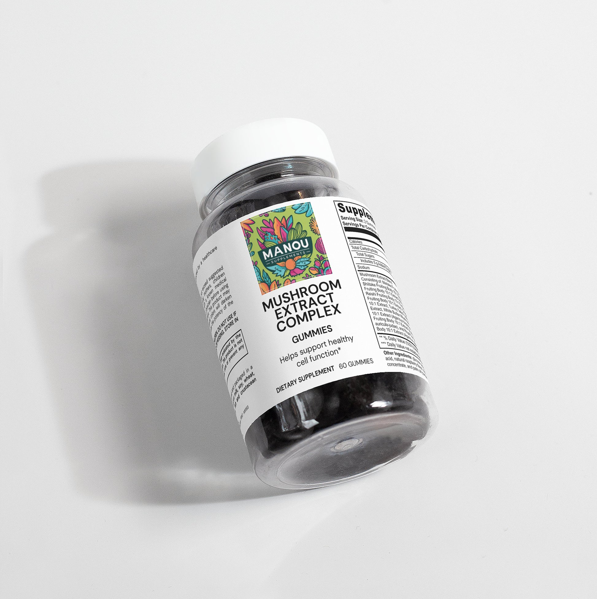 Ingredients: Mushroom extract (Maitake Fruiting Body 10:1 Extract, Shiitake Fruiting Body 10: 1 Extract, Lion’s Mane Fruiting Body 10:1 Extract, Reishi Fruiting Body 10:1 Extract, Cordyceps Fruiting Body 10:1 Extract, Chaga Fruiting Body 10:1 Extract, Turkey Tails Fruiting Body 10:1 Extract, White Button Mushroom Fruiting Body 10:1 Extract, Black Fungus Fruiting Body 10:1 Extract, Royal Sun Mushroom Fruiting Body 10:1 Extract), glucose syrup, sugar, dextrose, pectin, citric acid, natural raspberry flavor, sodium citrate, purple carrot juice concentrate, palm oil (contains carnauba wax).